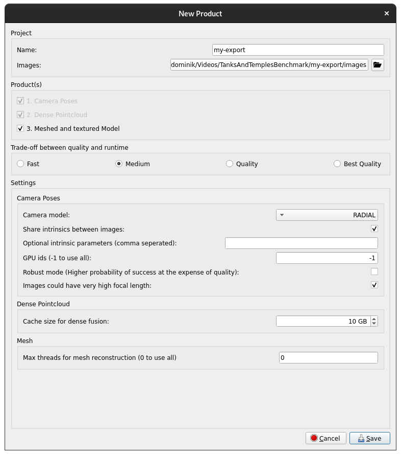 In the New Product-dialog, your last export is selected ath the top. Below, you can choose the products you want to created. The Camera Poses and Dense Point Cloud are computed using Colmap. The Meshed and textured Model is only available if OpenMVS is installed as well.