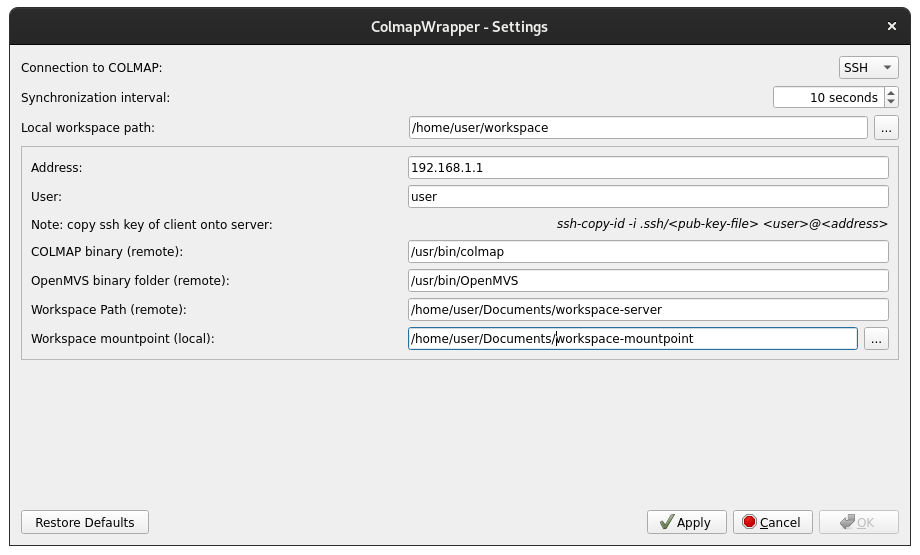 After you installed the required tools on the server and client, make sure you enabled ssh-server and mounted the workspace from the server to the mountpoint using SSHFS. Now we can start iVS3D on the client and open the Colmap-Wrapper-Settings. Choose SSH and enter your username and the server ip. You can pick a workspace on your client and select the mountpoint. iVS3D also needs the paths to COLMAP, OpenMVS and the workspace ON THE SERVER.