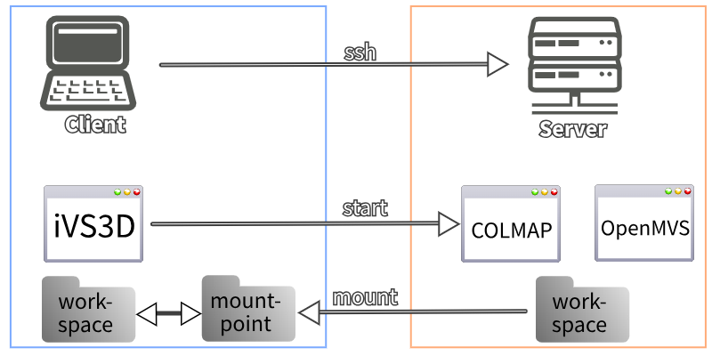 For syncing data between the server and client, iVS3D reuires a folder from the server (we call it workspace) to be mounted to the clients file system. We call the mount point on the client mountpoint. This can be done using SSHFS.